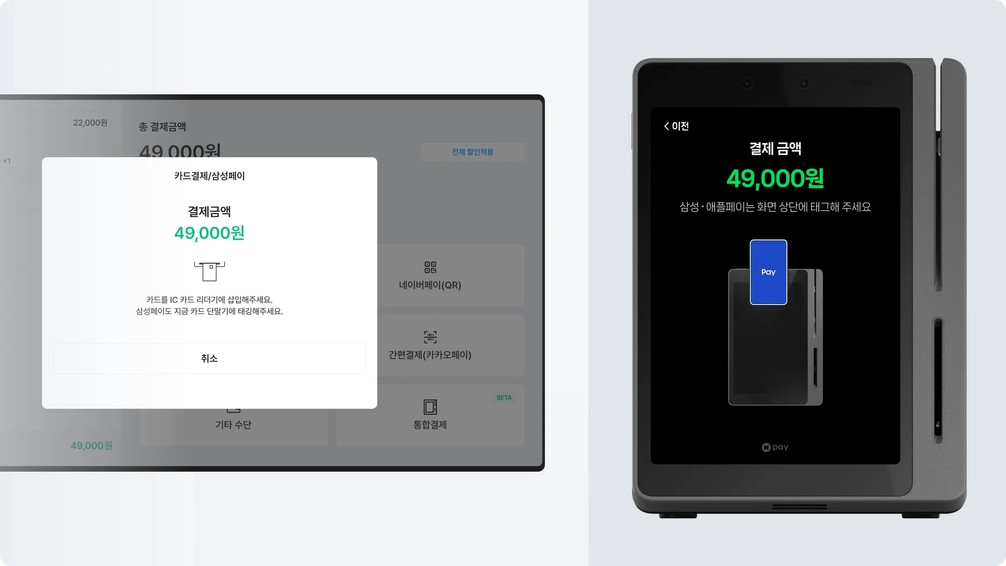 Npay 커넥트에서 고객이 카드 삽입 또는 휴대전화를 화면과 같이 대어 결제를 완료해 주세요.