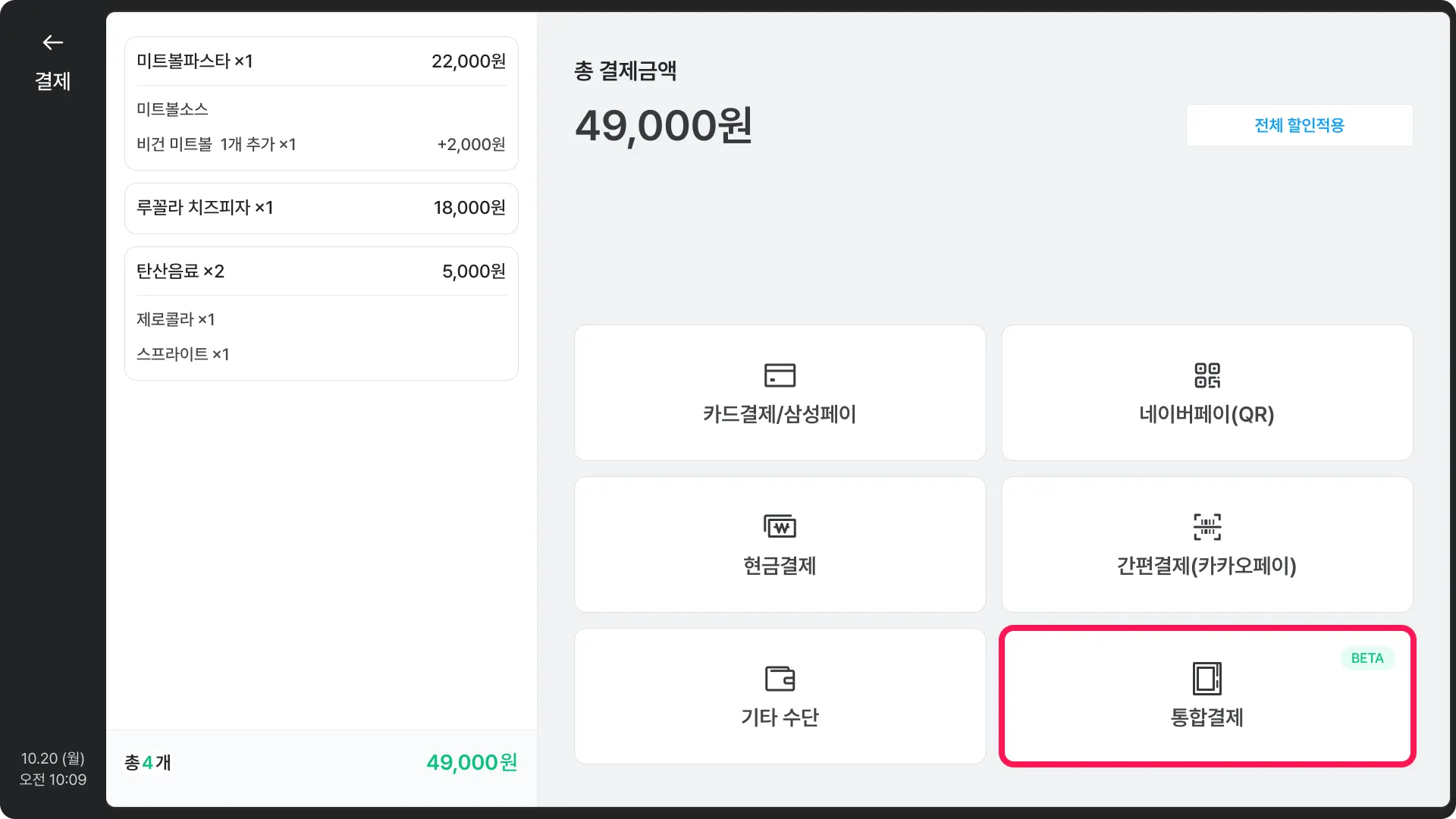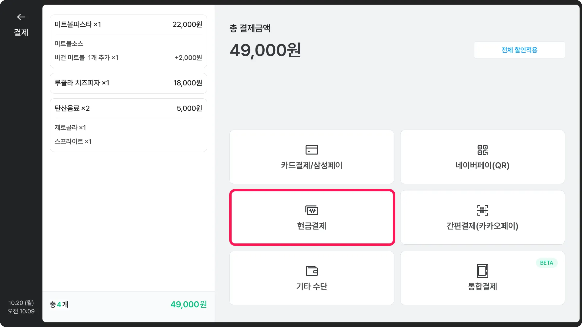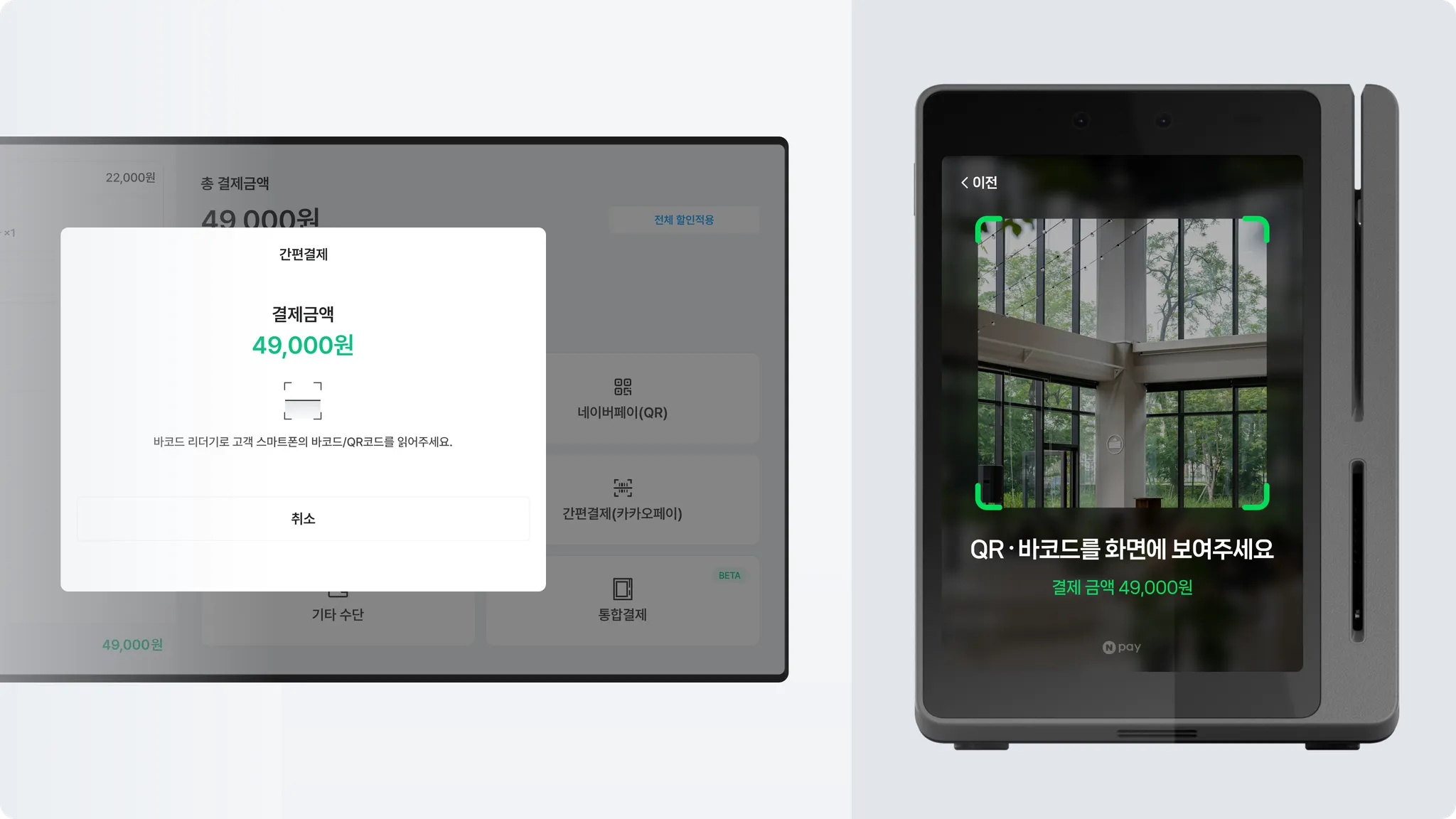 포스에서 [네이버페이(QR)] 또는 [간편결제(카카오페이)]를 누른 후,