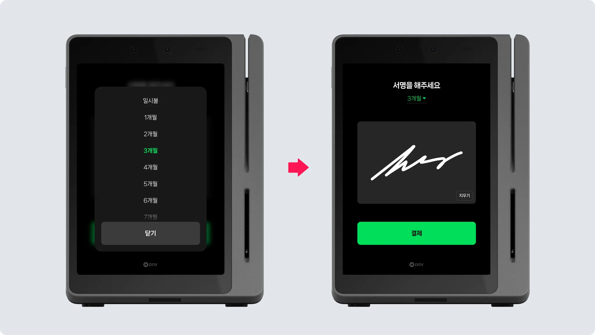 할부개월 선택, 현금영수증 번호 입력 포스에서만 가능
