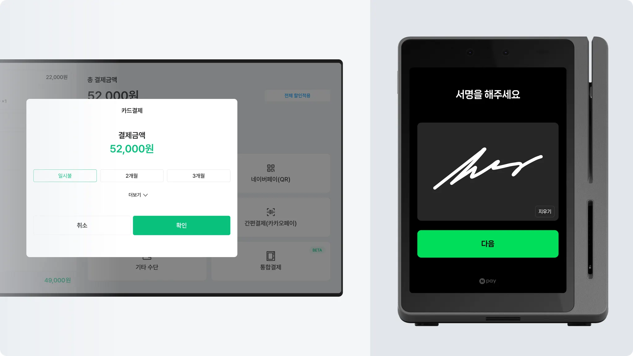5만원 초과 : 할부 선택 + 결제 서명 필요