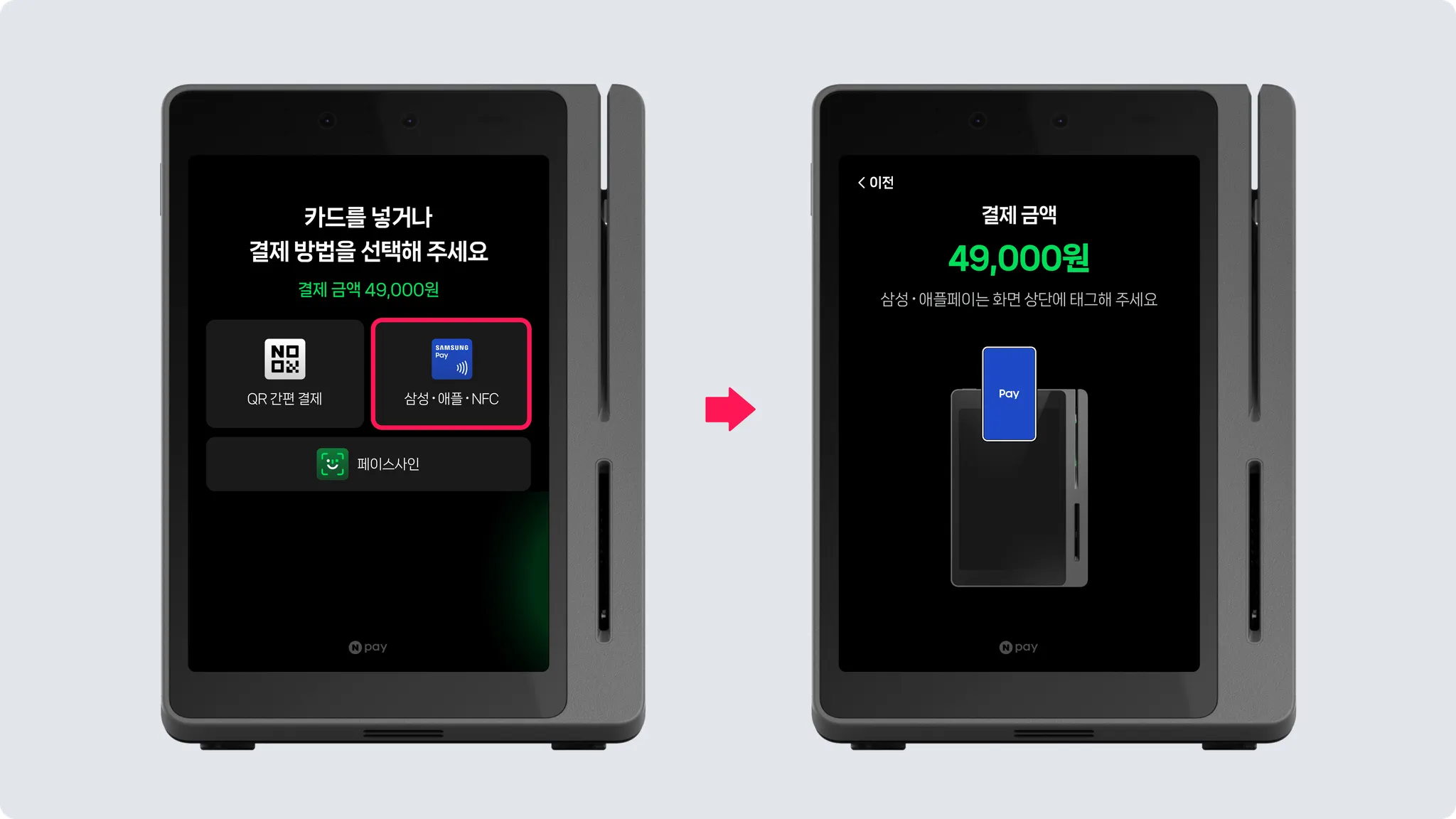 삼성•애플•NFC : [삼성•애플•NFC]를 누른 후, 카드삽입 또는 휴대전화를 화면과 같이 대주세요.