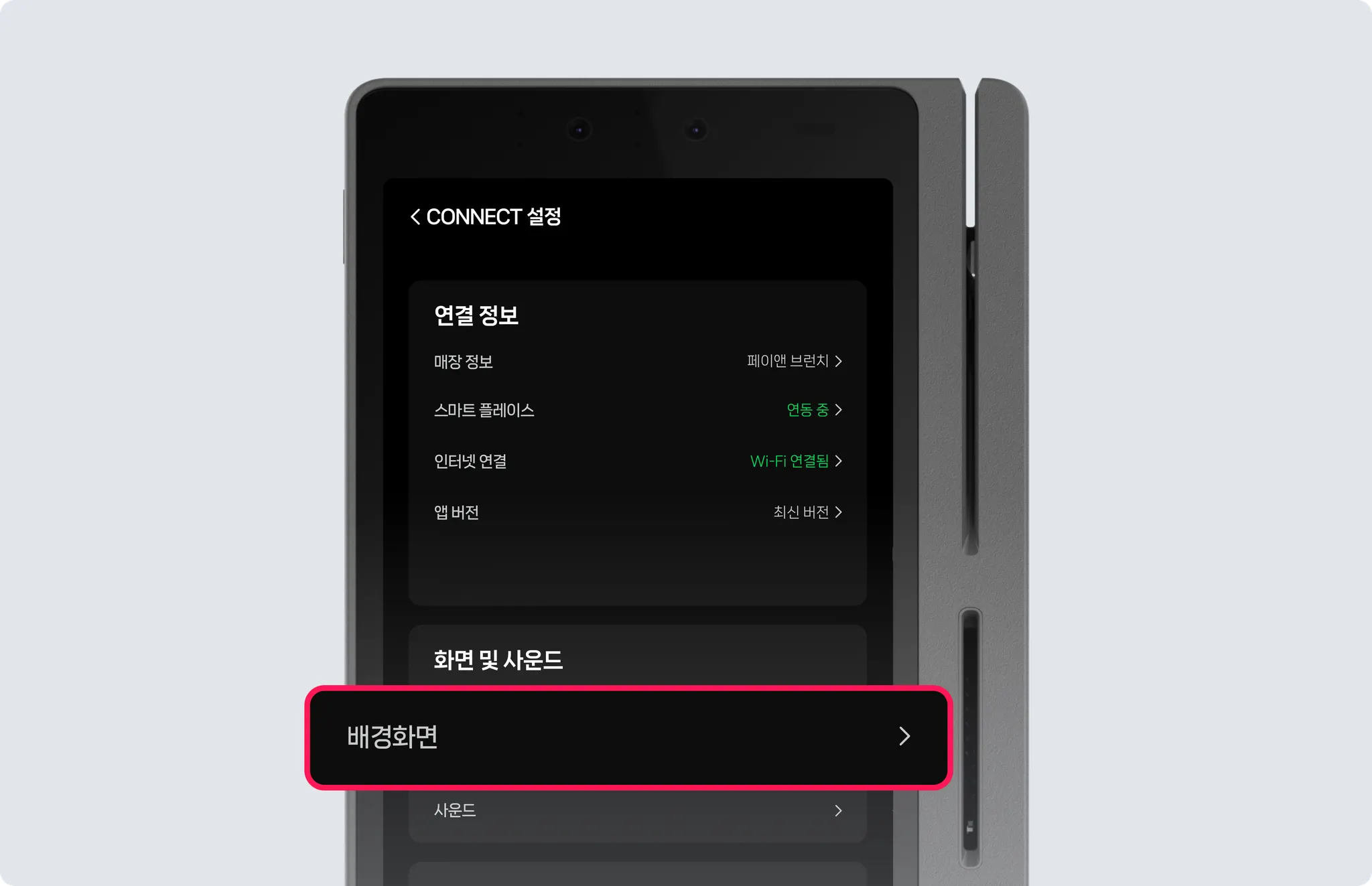 [화면 및 사운드] > [배경 화면]을 눌러주세요.