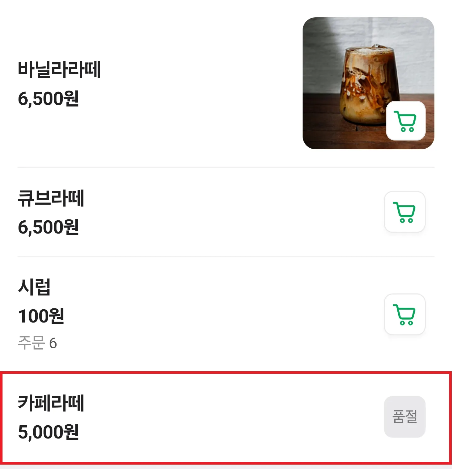 ex) 따뜻한 우유4,000원 → 카페라떼 5,000원상품 품절 처리(네이버 주문)