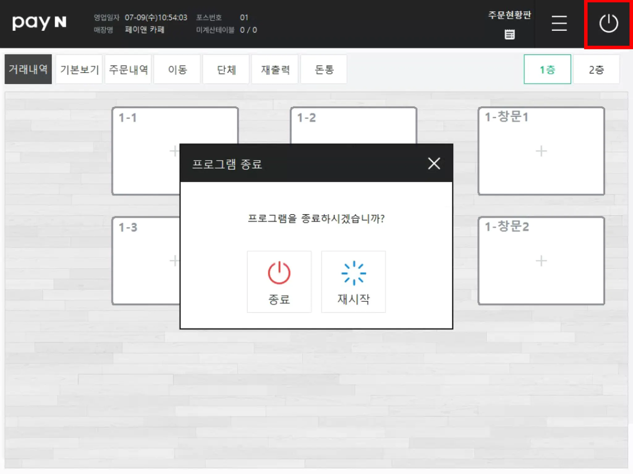 [전원] 아이콘을 누른 후, 프로그램 종료 또는 재시작을 선택할 수 있어요.