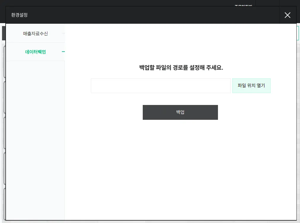 저장 경로를 설정한 후, [백업]을 누르면 포스 데이터의 백업이 진행돼요.•