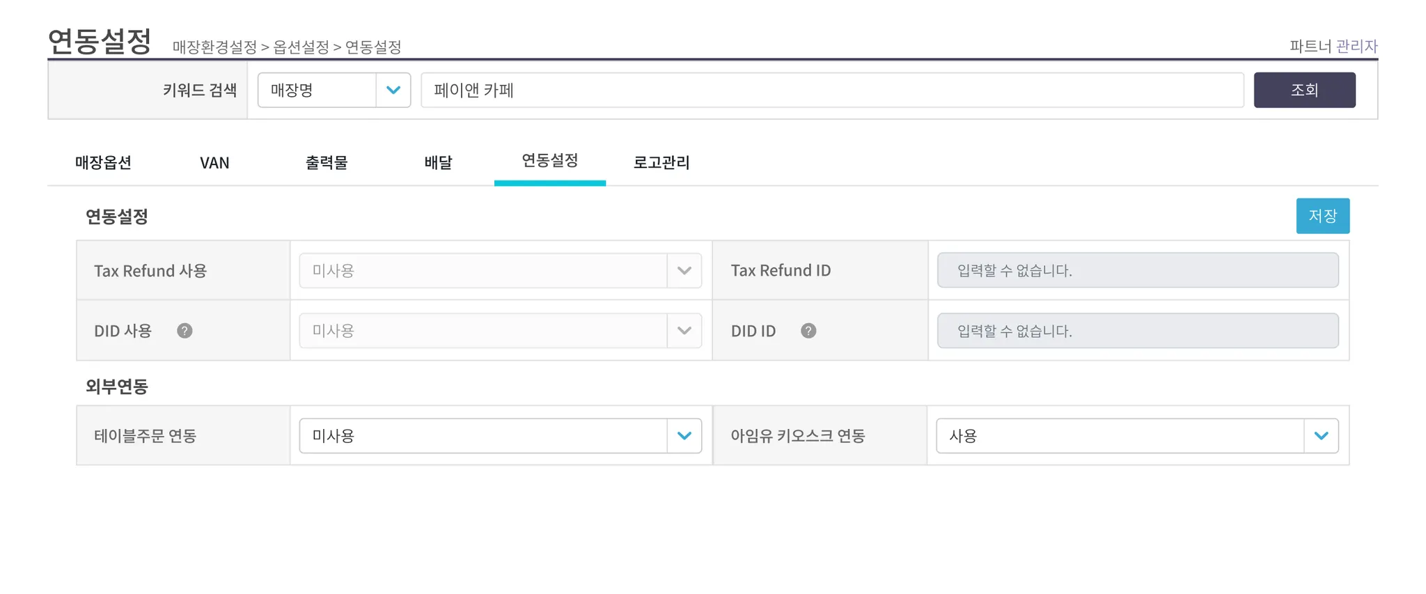 페이앤 모집인 페이지 내 [매장환경설정] > [옵션설정] > [연동설정]에서