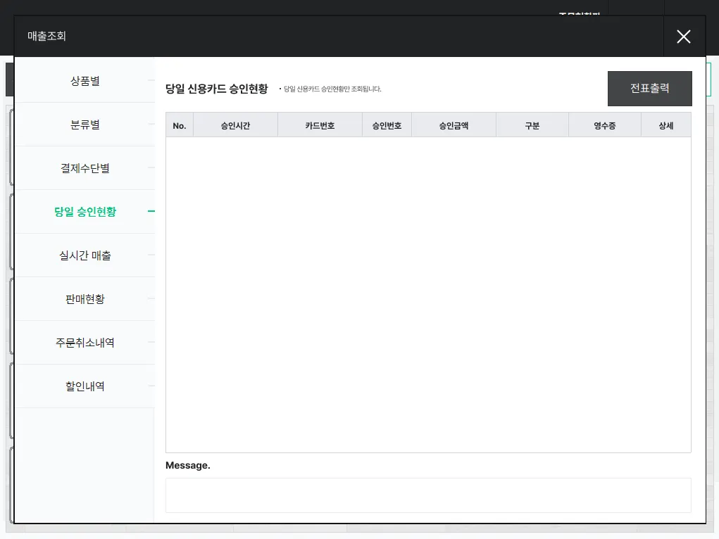[☰] > [매출 조회] > [당일 승인현황]에서 당일 신용카드 승인 현황을 확인할 수 있어요.