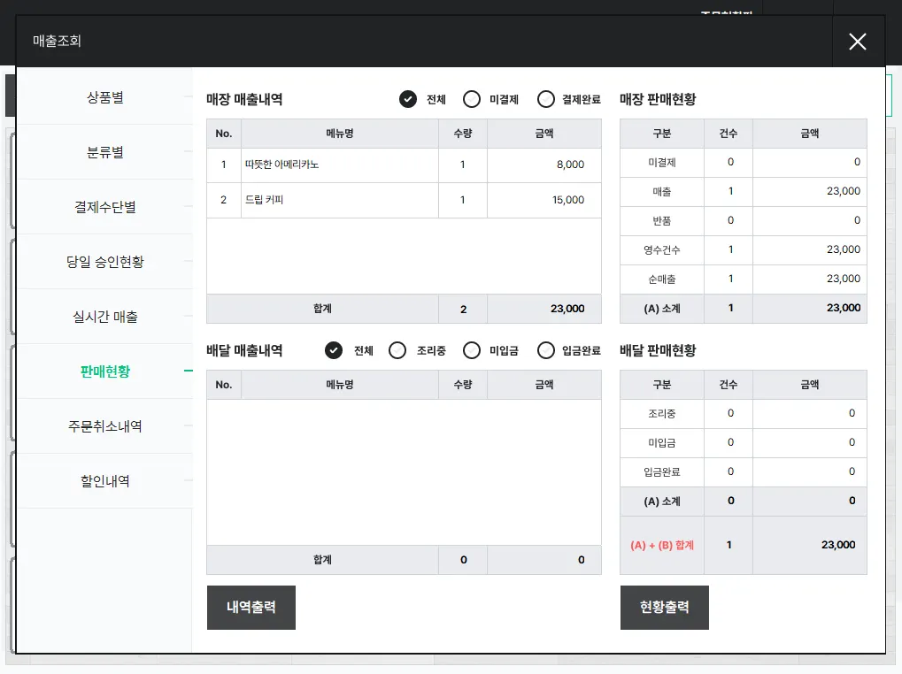 [☰] > [매출 조회] > [판매현황]에서 당일 판매현황을 확인할 수 있어요.