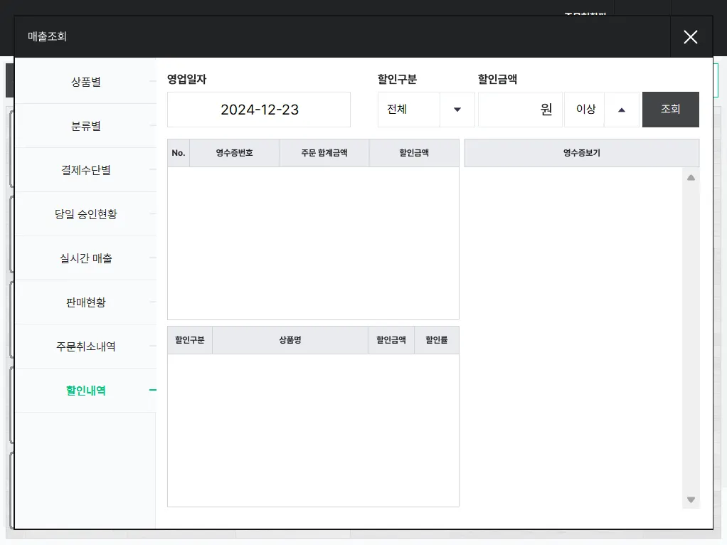 영업일자, 할인구분(일반할인, 서비스 등)을 선택한 후, [조회]를 눌러주세요.