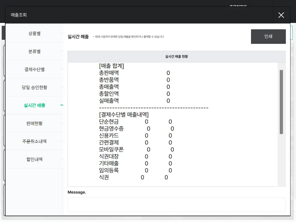 [인쇄]를 누르면, 조회 시점까지의 당일 매출을 출력할 수 있어요.