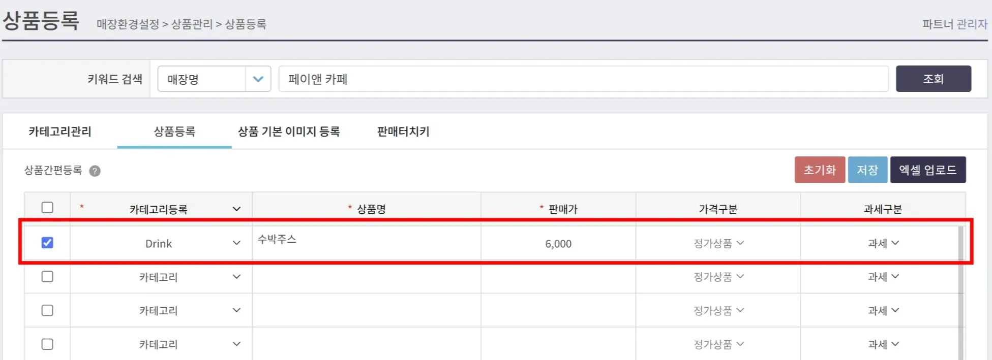 페이앤 모집인 페이지 내 [매장환경설정] > [상품 관리] > [카테고리 관리/상품등록]에서 카테고리와 상품을 등록해 주세요.