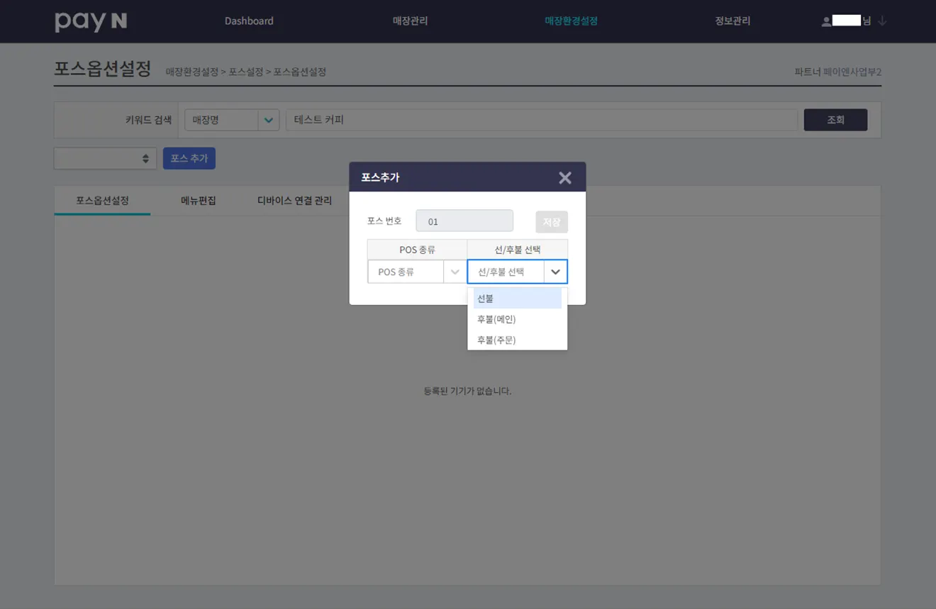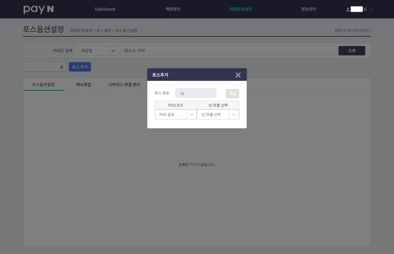 매장 생성 시 [포스 추가]를 누른 후, 포스옵션 설정을 추가해 주세요.•