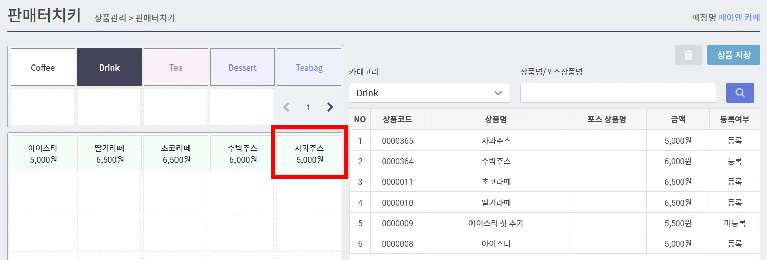 페이앤 사장님 페이지 내 [상품 관리] > [판매터치키]에서 상품을 판매터치키에 등록해 주세요.•