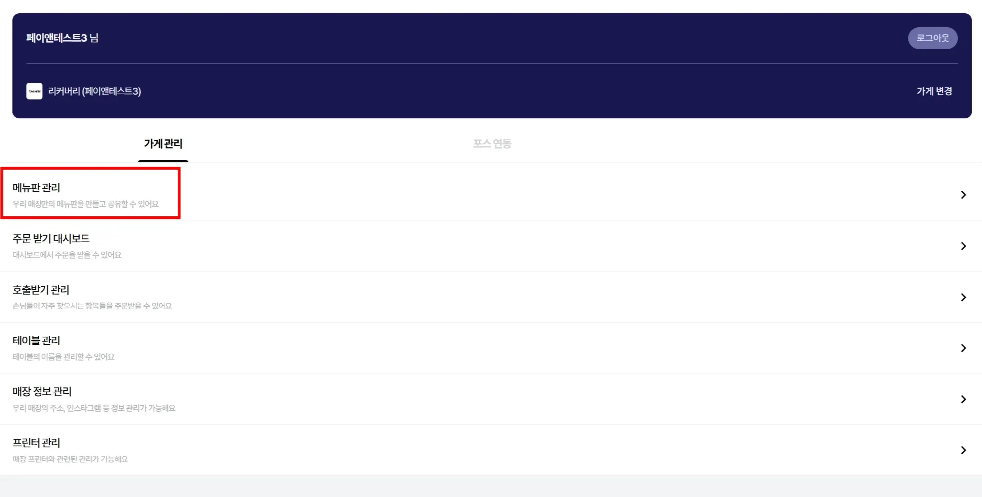 페이앤 사장님 페이지 내 [포스 관리] > [포스] > [테이블 등록]을 눌러주세요.