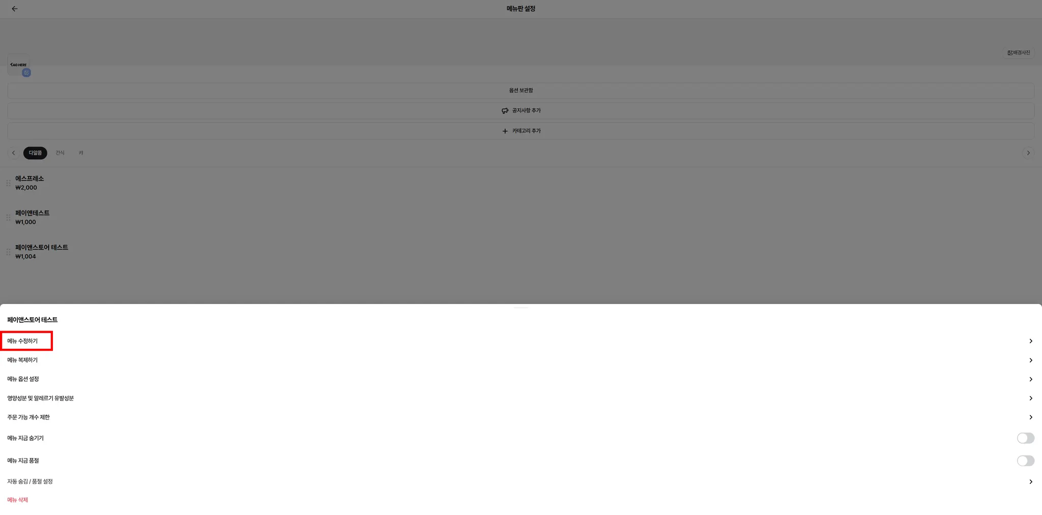 수정할 상품을 선택한 후, [메뉴 수정하기]를 눌러주세요.