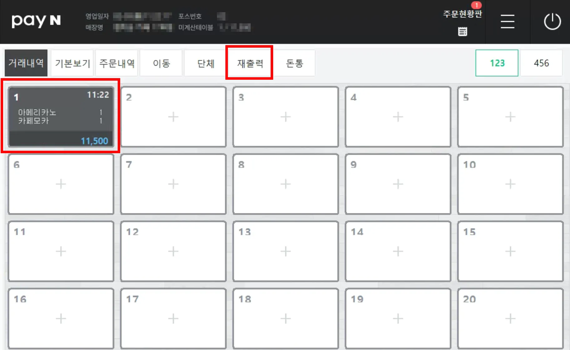 [재출력]에서 주문서 재출력이 필요한 테이블을 선택해 주세요.