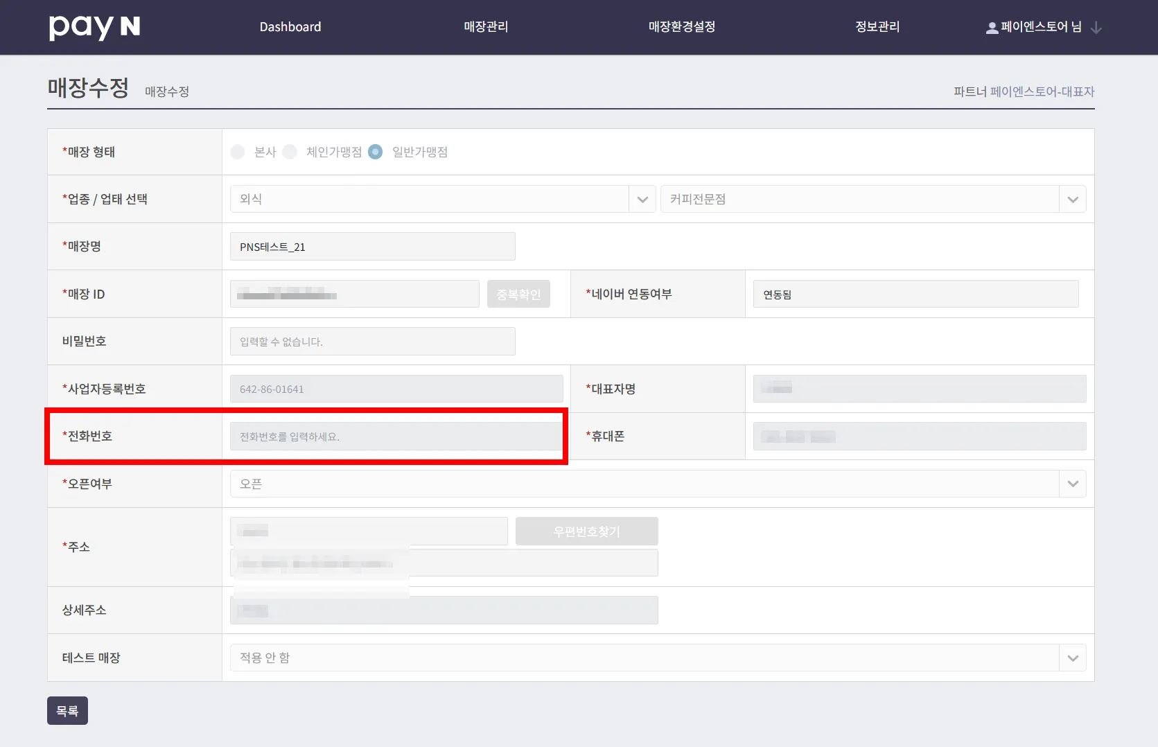 [매장명]을 누르면 매장환경설정으로 이동해요.