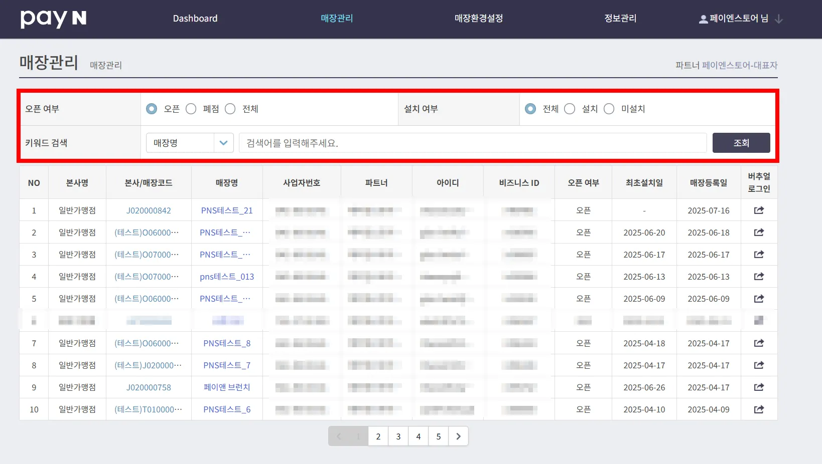 매장을 검색하거나 매장에 대한 최초 설치일, 매장등록일 등 정보 확인할 수 있어요.